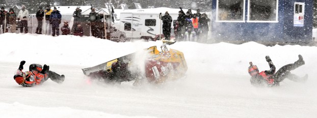 Jacques Villeneuve falls off his snowmobile after colliding with Colt Dellandrea during the last lap of the final race in the Hastings Cup snowmobile race in Bancroft Feb. 2. Photo by Kaitlin Abeele