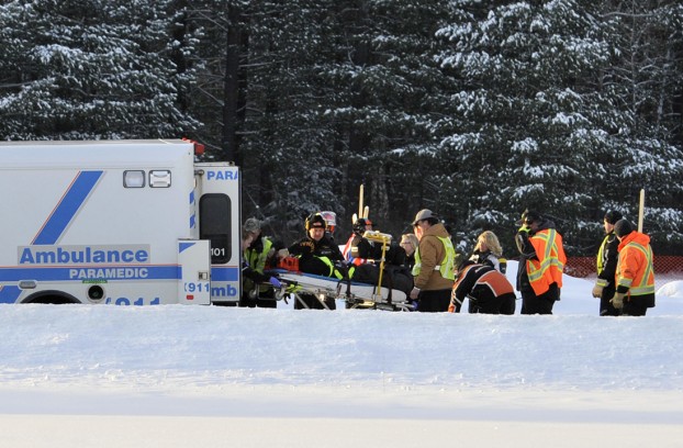 Paramedics load Mike Van Dolder into the back of an ambulance during the final race of the Hastings Cup snowmobile race in Bancroft Feb. 2. Van Dolder collided with Andrew Darraugh during the first of 10 laps and was dragged along the ice track underneath Darraugh’s snowmobile. Van Dolder was hurt, but responsive. Photo by Kaitlin Abeele