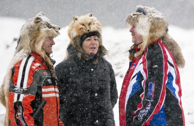 (From left) John Peterson, Elena Peterson and Bill Moffat chat during a track-cleaning break at the 2014 Hastings Cup on Feb.1. Photo by Dillan Cools