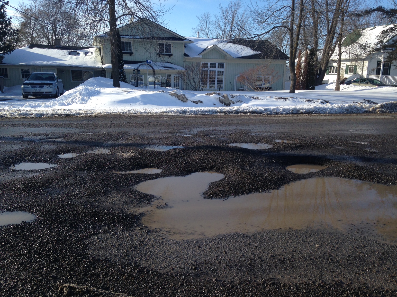 CANNIFTON – As temperatures rise above 0C, potholes are emerging and becoming a big problem. These potholes are north of Belleville at the corner of Tank Farm Road and Cannifton Road in Cannifton. Photo by Greg Murphy