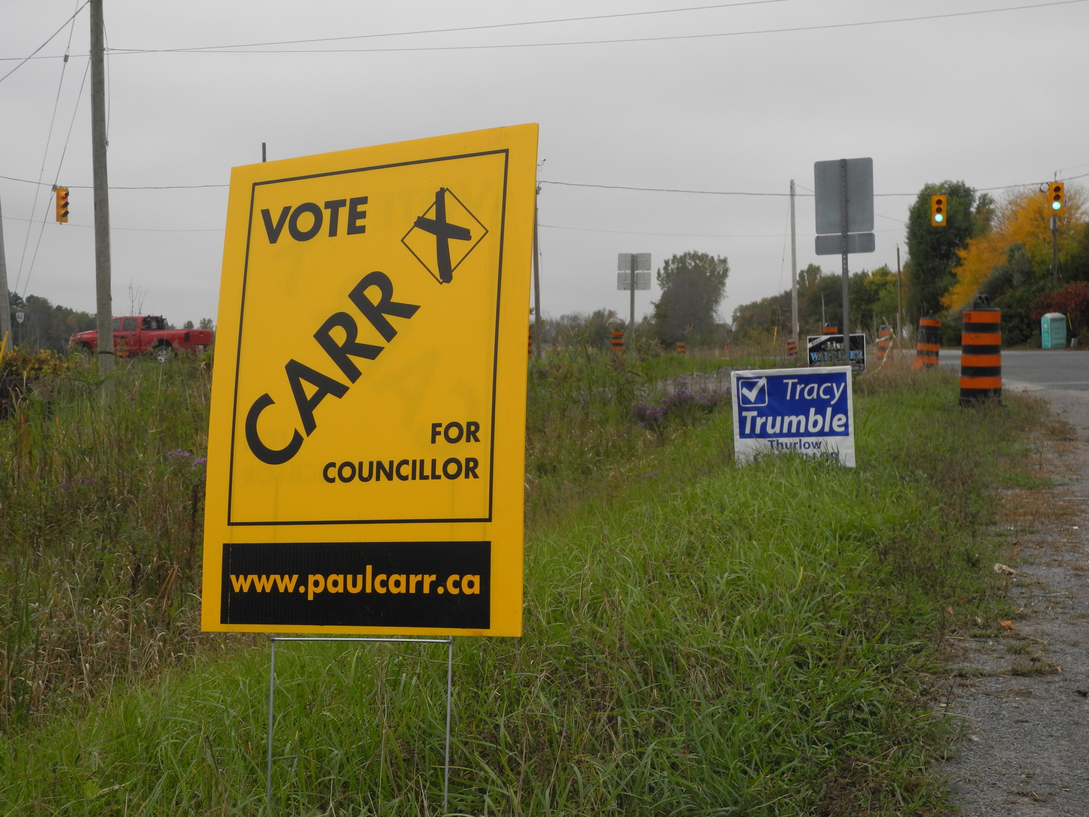 Campaign signs for the mayoral and council race can be found throughout rural Thurlow Ward. Photo by Amanda Lorbetski