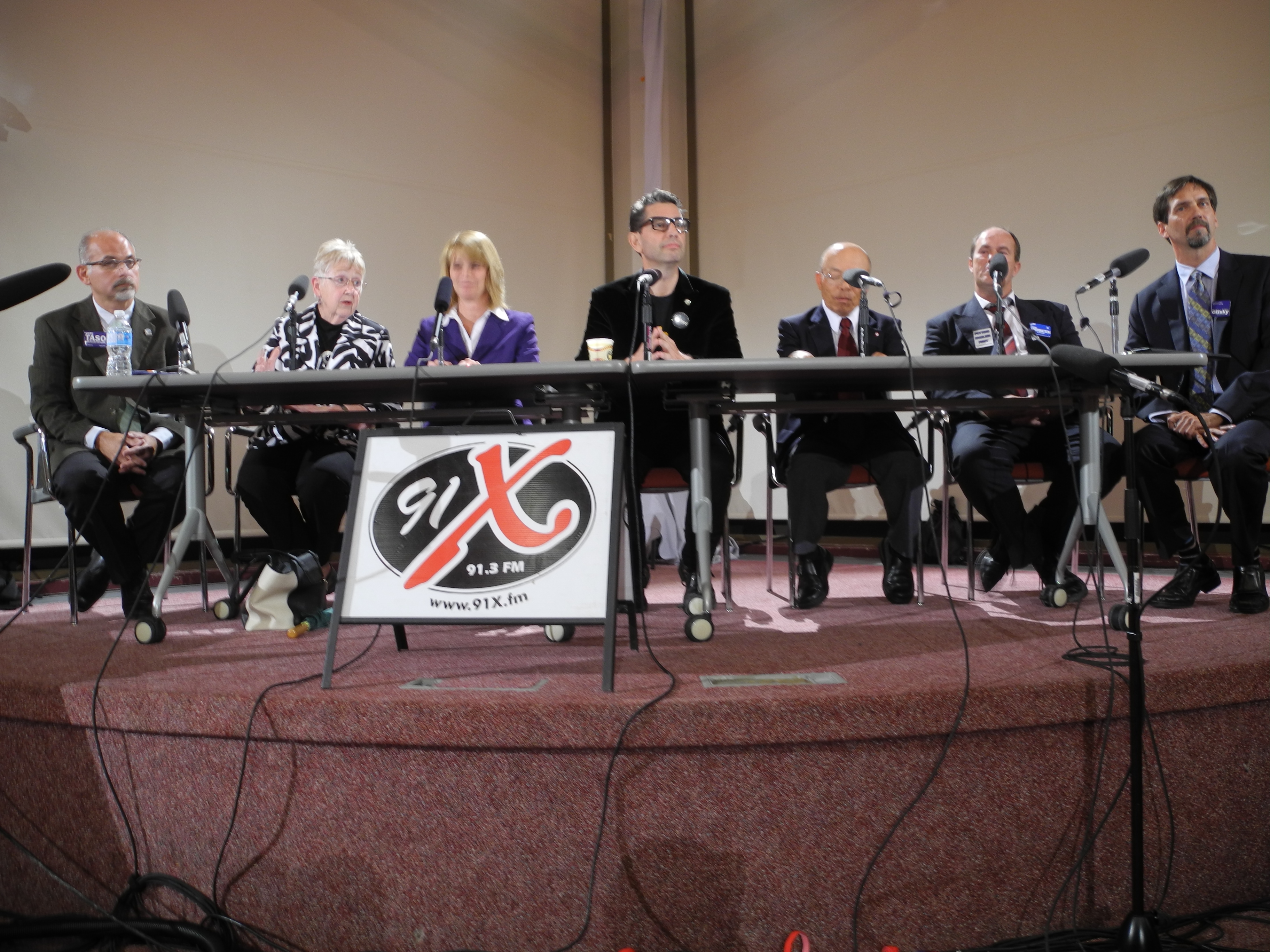 Mayoral candidates at Tuesday night’s all-candidates event at Loyalist: from left, Taso Christopher, Pat Culhane, Jill Raycroft, Richard Davis Courneyea, Kenzo Dozono, Lonnie Herrington and Bill Glisky. Photo by Joseph Quigley
