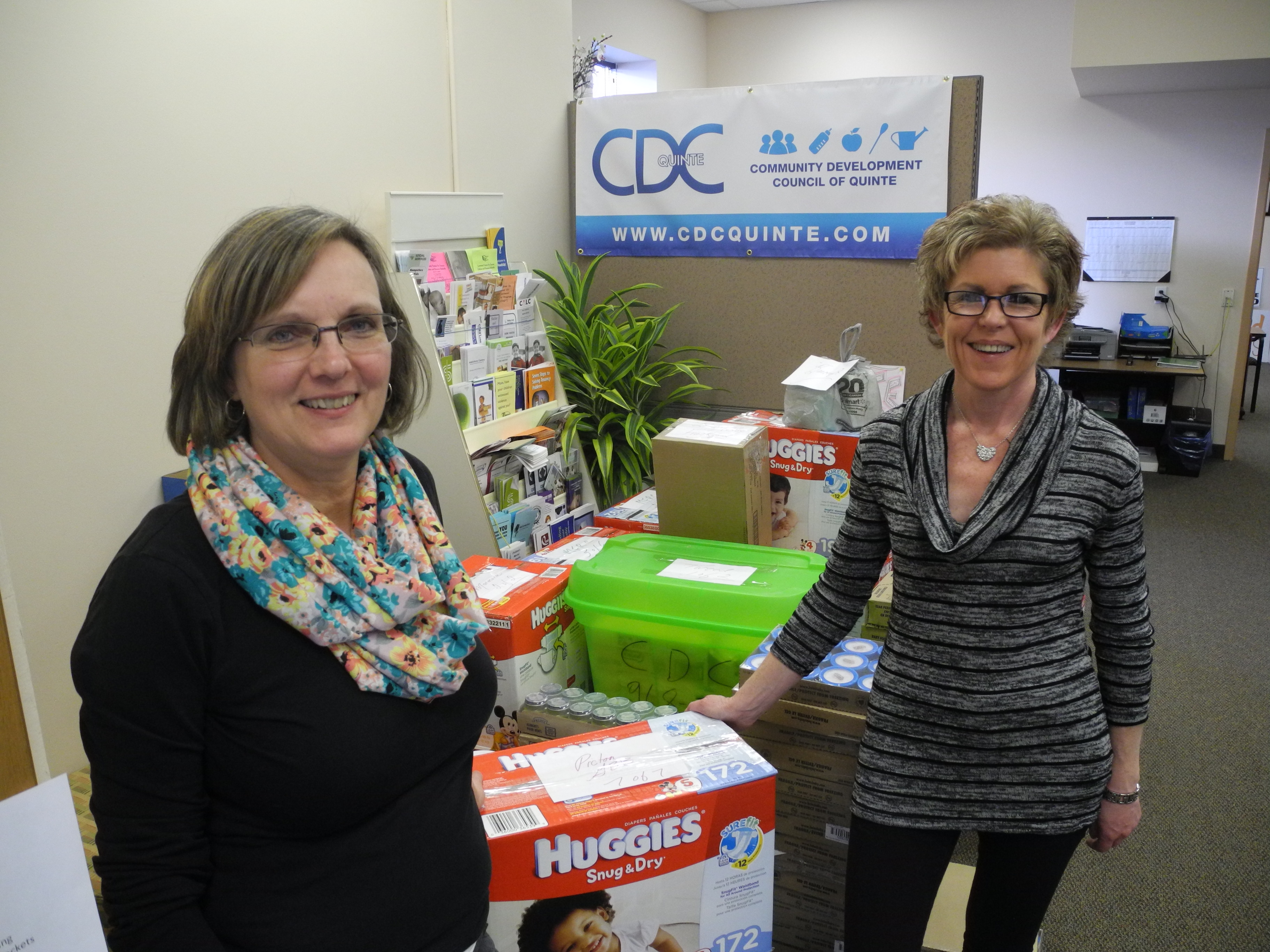 Ruth Ingersoll (left) and Bev Heuving (right) are with the Community Development Council of Quinte. They pose for a picture with packages to be sent across Hastings and Prince Edward County for the Good Baby Box Program, offering products to parents at a reduced cost. Photo by Amanda Lorbetski