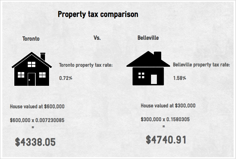 So a Belleville property-owner with a house valued at half the amount of one in Toronto ends up paying more in taxes than the Toronto owner does.