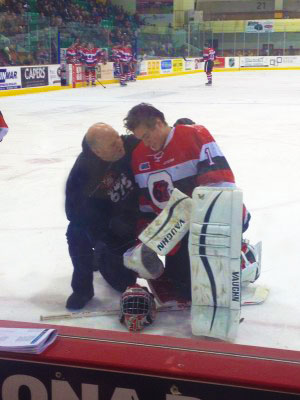 67’s goalie Liam Herbst is looked at by a team trainer after a collision with the Bulls’ defenceman Jordan Subban. Photo by Cam Kennedy