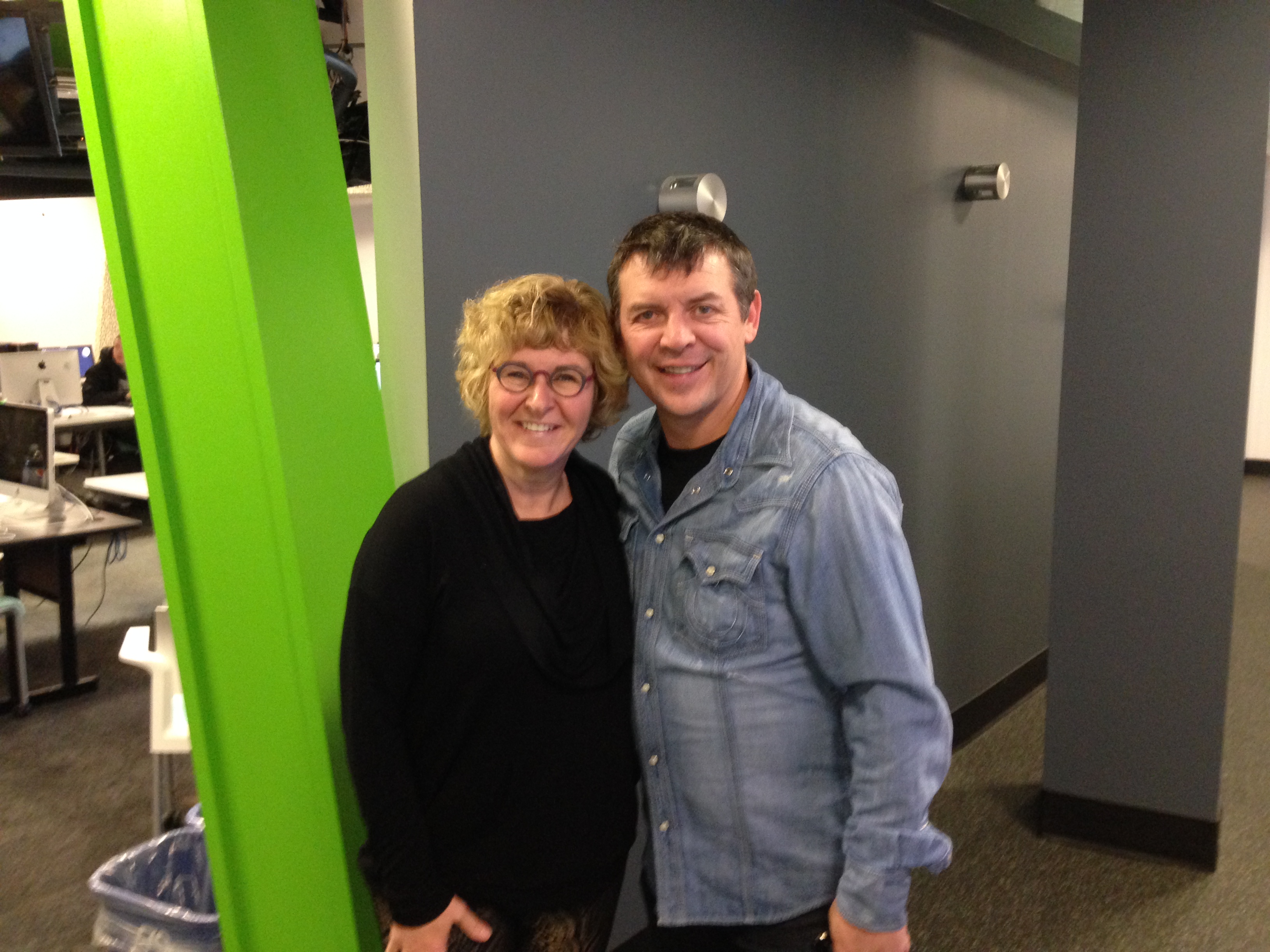 Theoren Fleury and co-author Kim Barthel stop by the Digital Media Centre at Loyalist College during their visit to Belleville on Tuesday. Photo by Shelden Rogers.