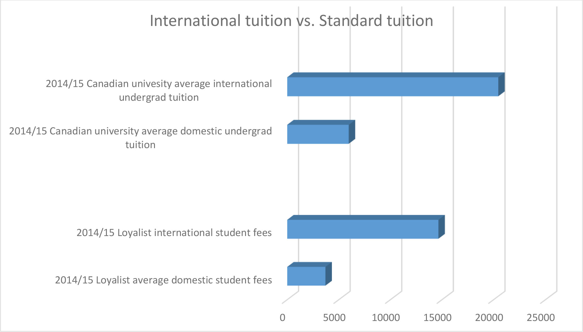 A chart representing international and domestic tuition fees. Loyalist students pay approximately $3,800 in fees per year, less than the $14,650 that international students pay per year. According to Statistics Canada, the situation is similar in post-secondary institutions across the country: $5,959 is the average university undergraduate tuition, compared to $20,447 for international students.