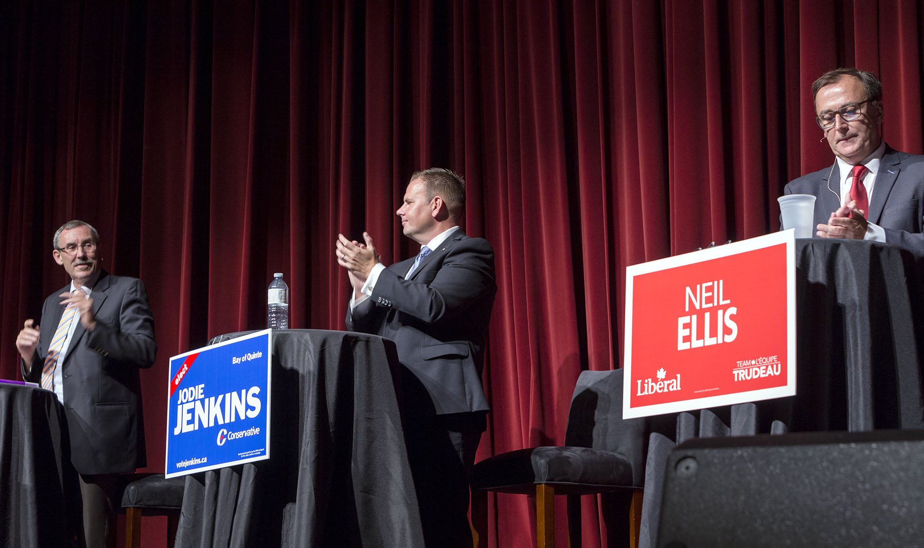 BELLEVILLE – Candidates Terry Cassidy of the New Democratic Party (left), Jodie Jenkins of the Conservatives and Neil Ellis of the Liberals debated before a full house at the Empire Theatre Wednesday. Photo by Hannah Lawson, Loyalist Photojournalism.