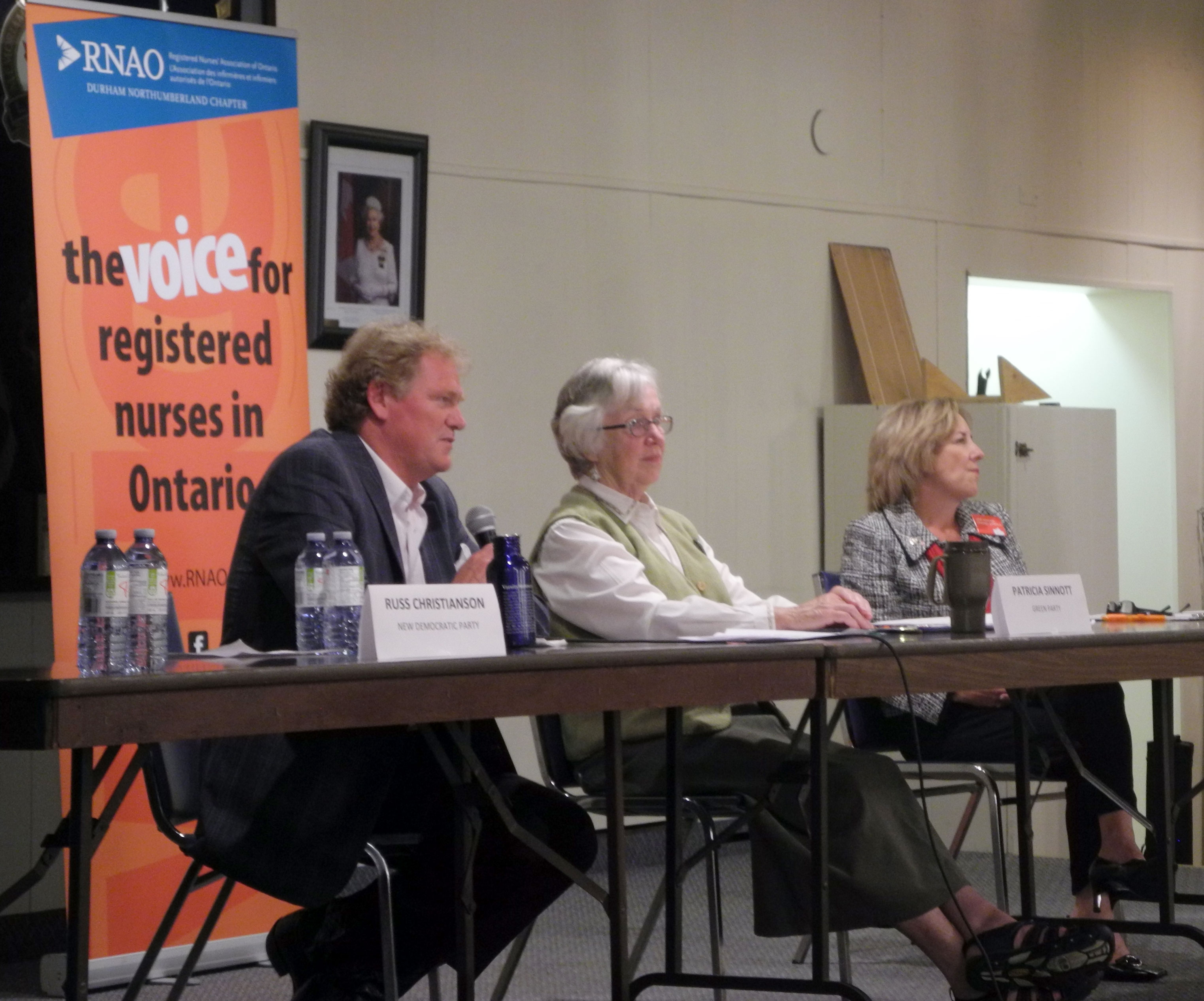 Liberal Kim Rudd, New Democratic Party candidate Russ Christianson and Green party candidate Patricia Sinnott generally agreed on a wide range of issues during the health-care focused debate hosted by the Registered Nurses Association of Ontario. Conservative Adam Moulton declined to attend the debate.
