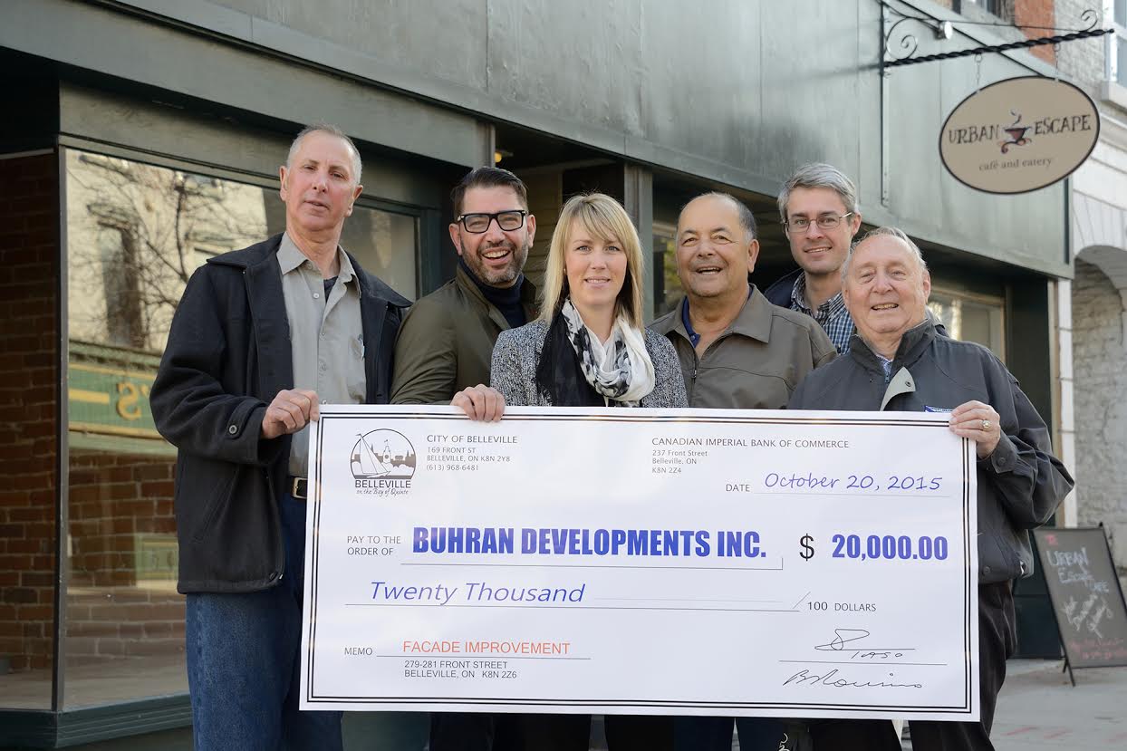 Zubin Gillespie (left) of Buhran Developments received a cheque from city facade improvement committee members Richard Courneyea, Karen Parker and Mike Graham, city special-projects planner Greg Pinchin and facade committee member Robert Johnston. Photo submitted by Marilyn Warren