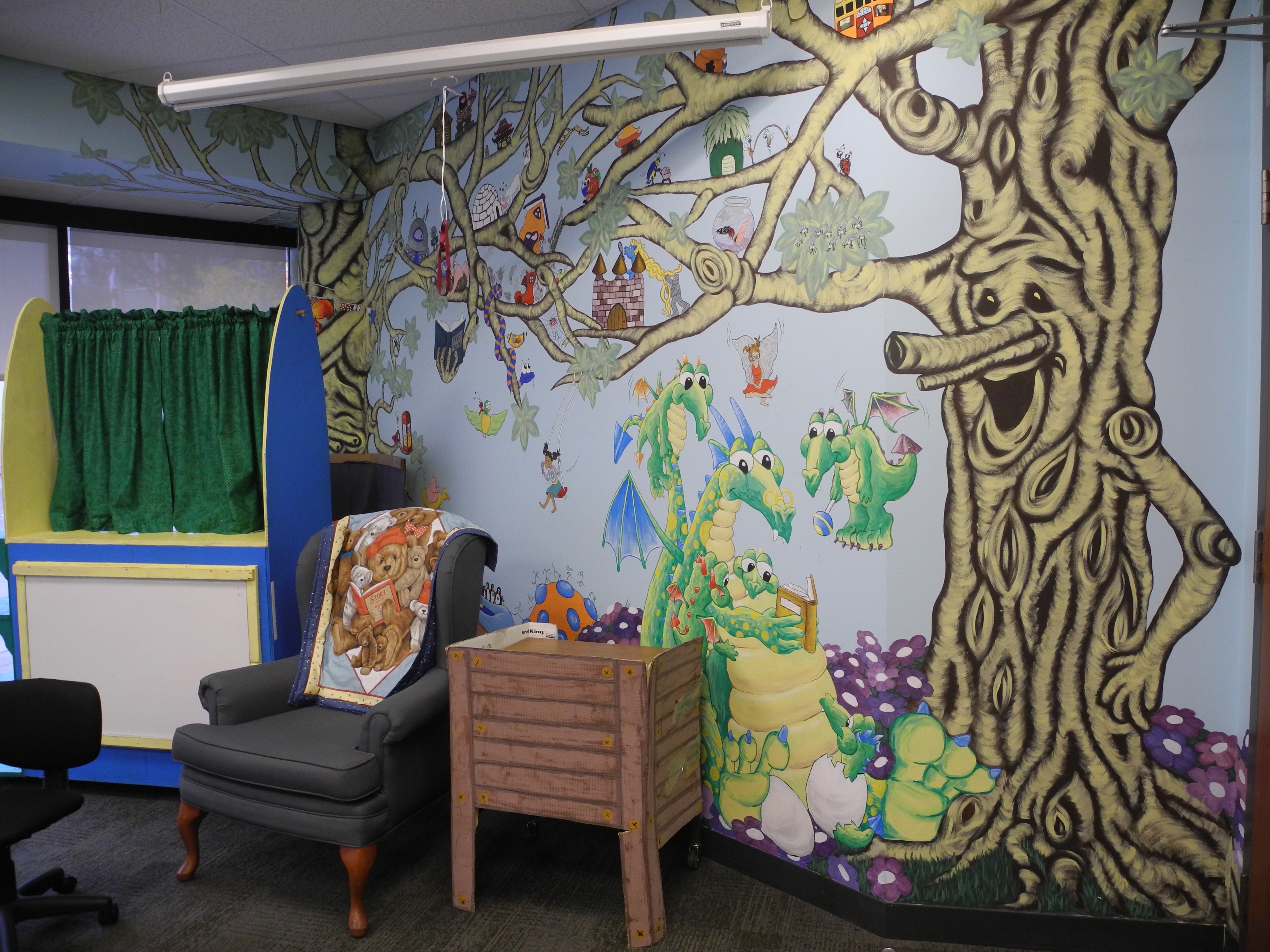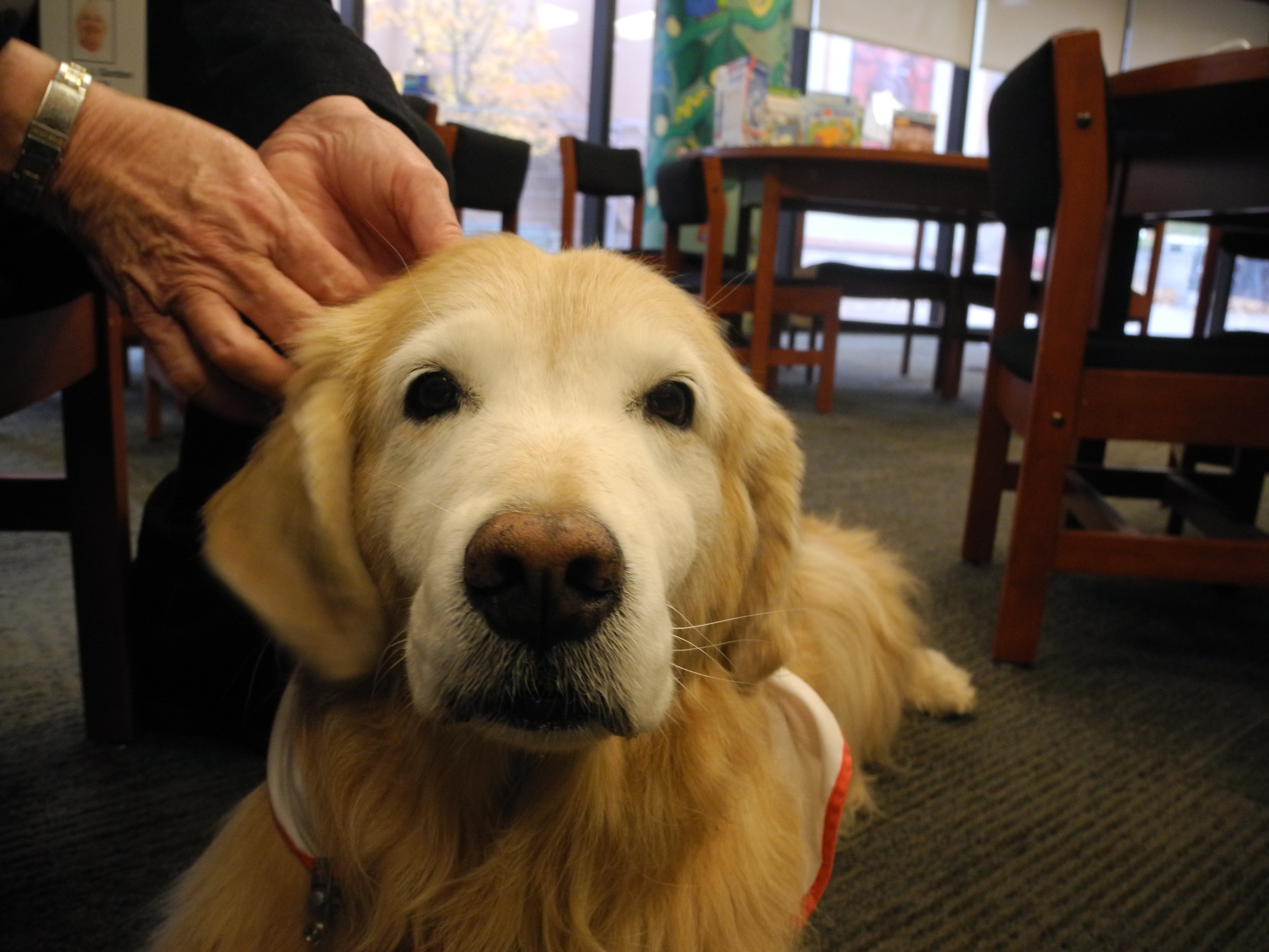 Paws for Reading is a program where children read aloud to therapy dogs to improve reading and communication skills. The children have individual sessions with the dog and their handler in the first-floor program room at the library. They each get 20-minute time slots with the dogs.