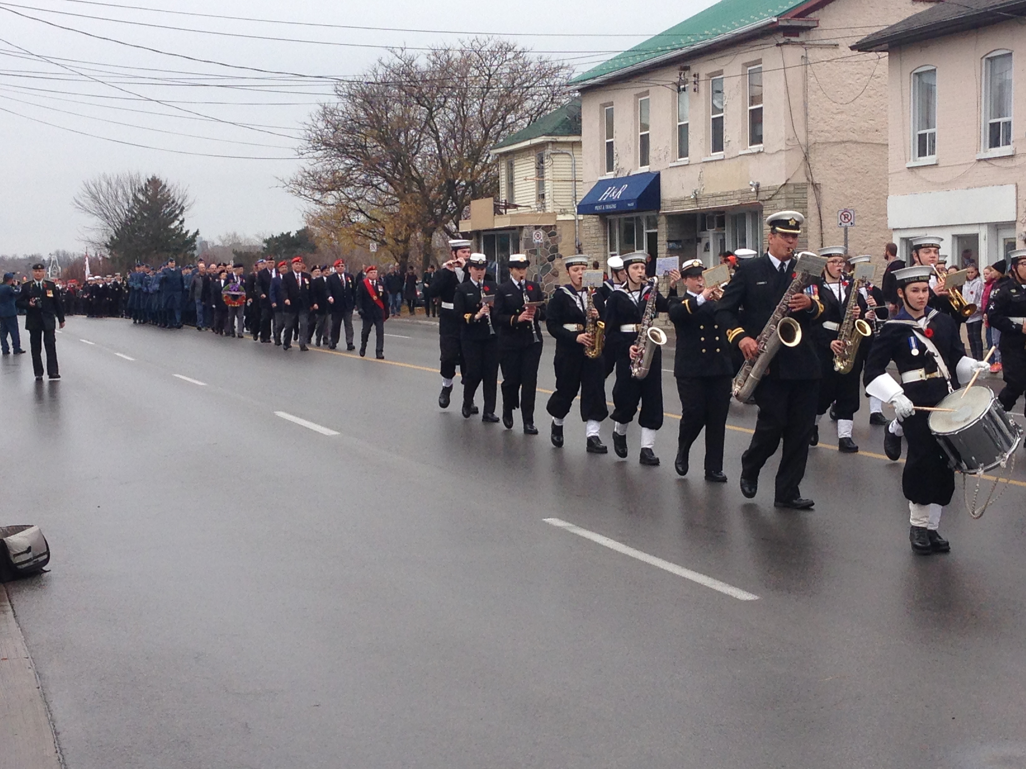 A regimental bagpiper led the group in the rain while it travelled on its path from the armouries on Bridge Street East to the cenotaph on Station Street. Veterans, cadets and local dignitaries marched behind, in ranks stretching from the memorial to Pinnacle Street, as spectators watched in silence.