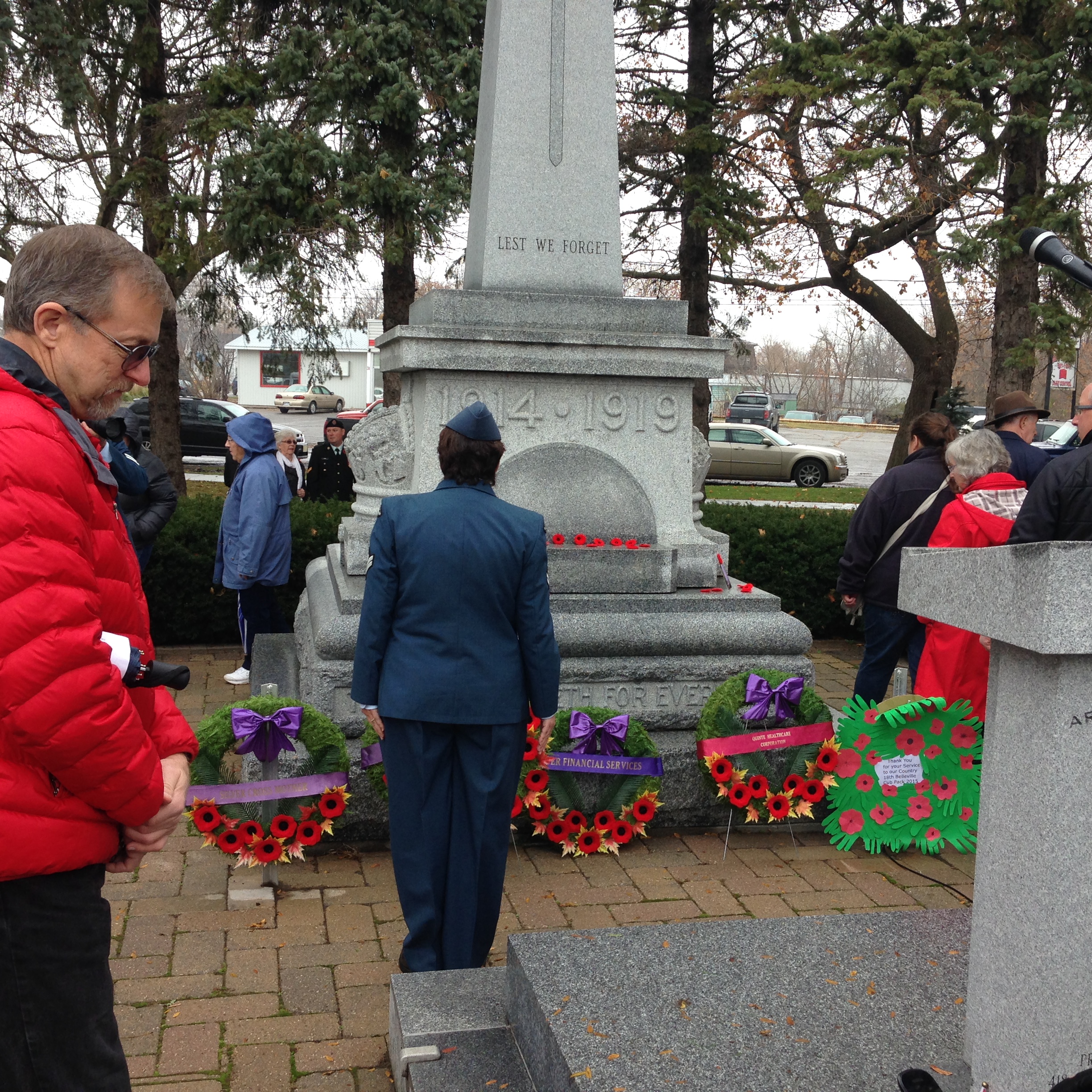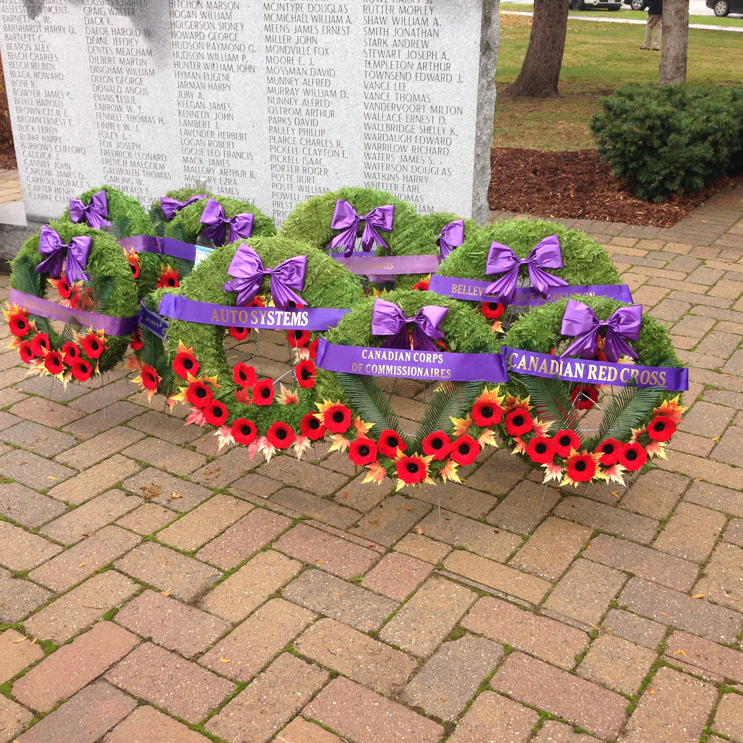 Representatives from local organizations, businesses, banks and schools laid wreaths in front of the cenotaph honouring the fallen. Newly elected Bay of Quinte MP Neil Ellis was among those who paid their respects with a wreath. After the ceremony, the majority of the wreaths were collected and stored at the Royal Canadian Legion, to be placed in front of the cenotaph on a monthly rotation throughout the year.