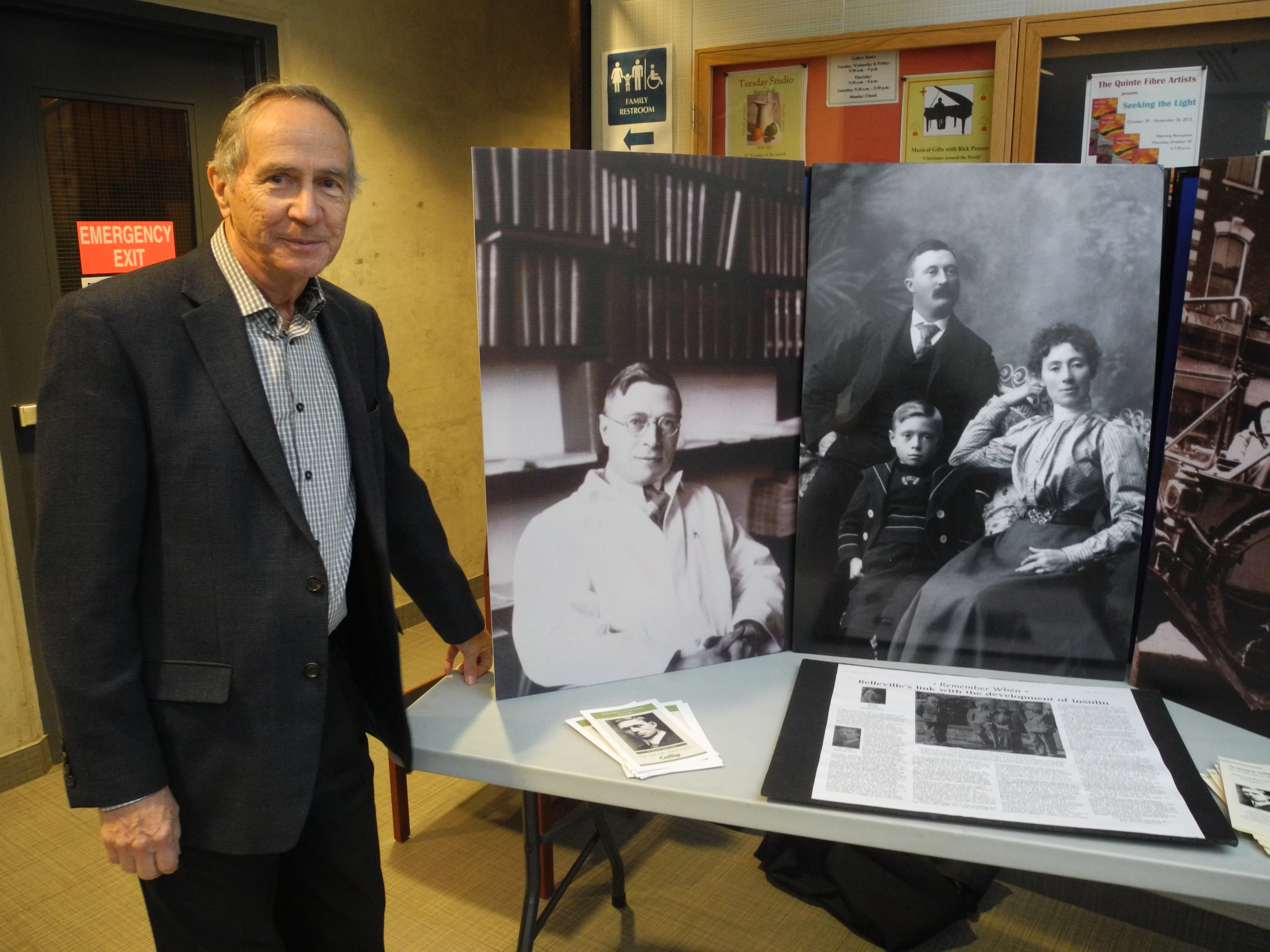 Richard Hughes, chair of the Dr. James B. Collip Recognition Committee, stands next to the committee’s display of the famed local doctor. The display was set up at the Belleville Public Library in celebration of Dr. James B. Collip Day on Nov. 20. Photo by Joseph Quigley