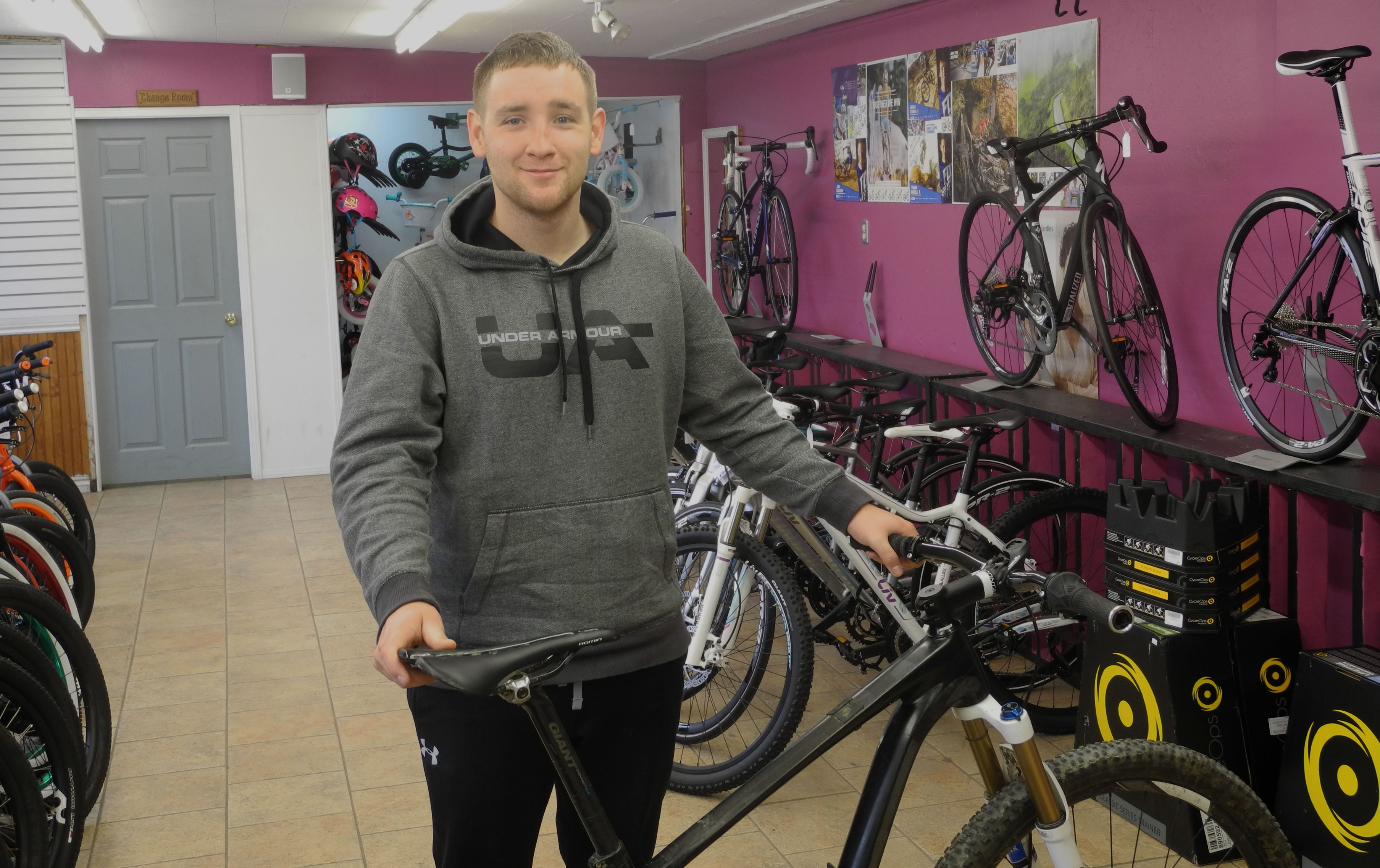 Tyler Allsopp with his mountain bike at his shop, Doug’s Bicycle Sales and Service. Allsopp has spearheaded the proposal for a mountain-bike trail through Riverside Park. Photo by Joseph Quigley, QNet News