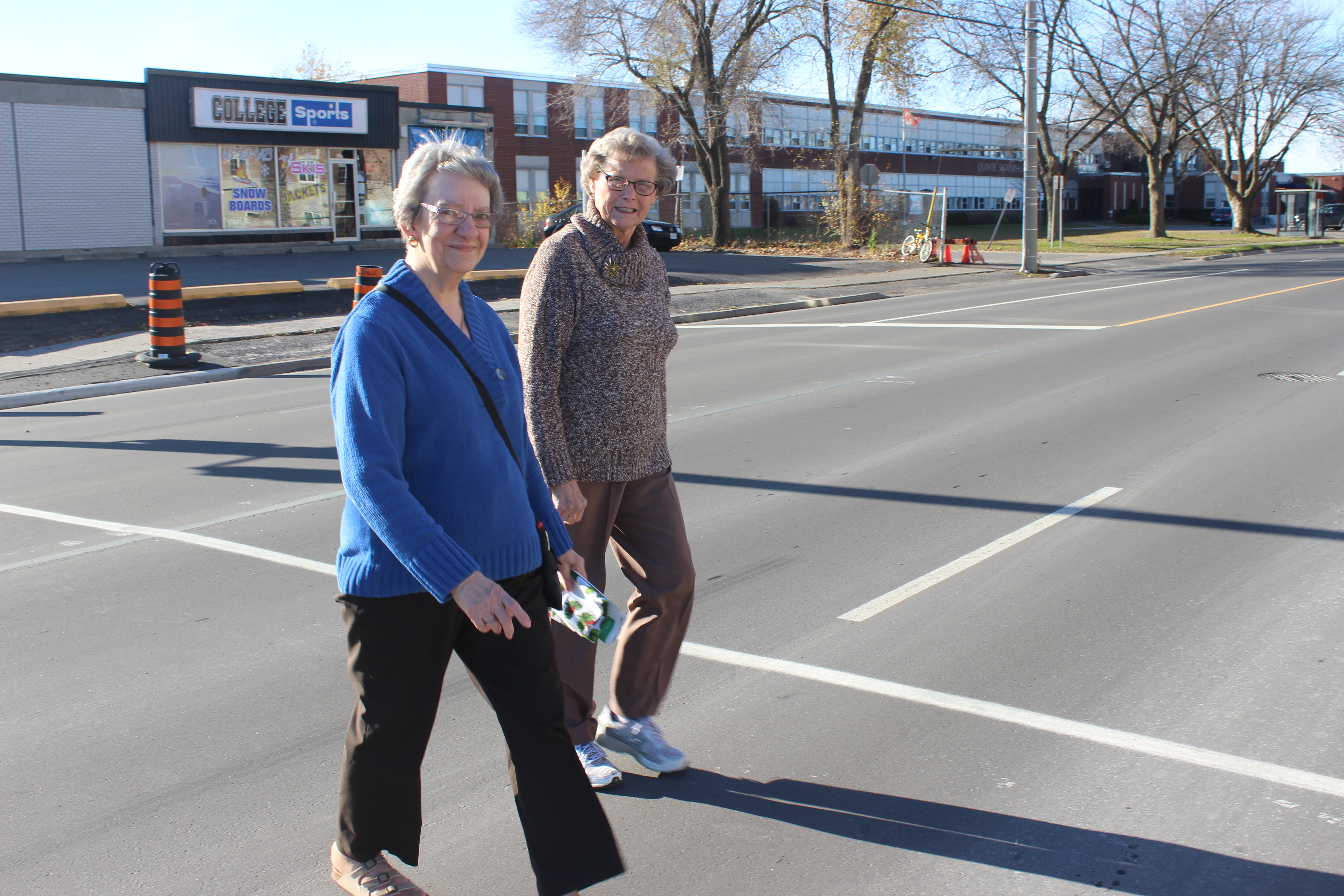 Pat DaSilva (left) and Margaret O’Neil use the newly installed crosswalk on College Street West. The duo have been working, alongside other Amica at Quinte Gardens residents, to get the crosswalk installed. Photo by Samantha Reed, QNet News