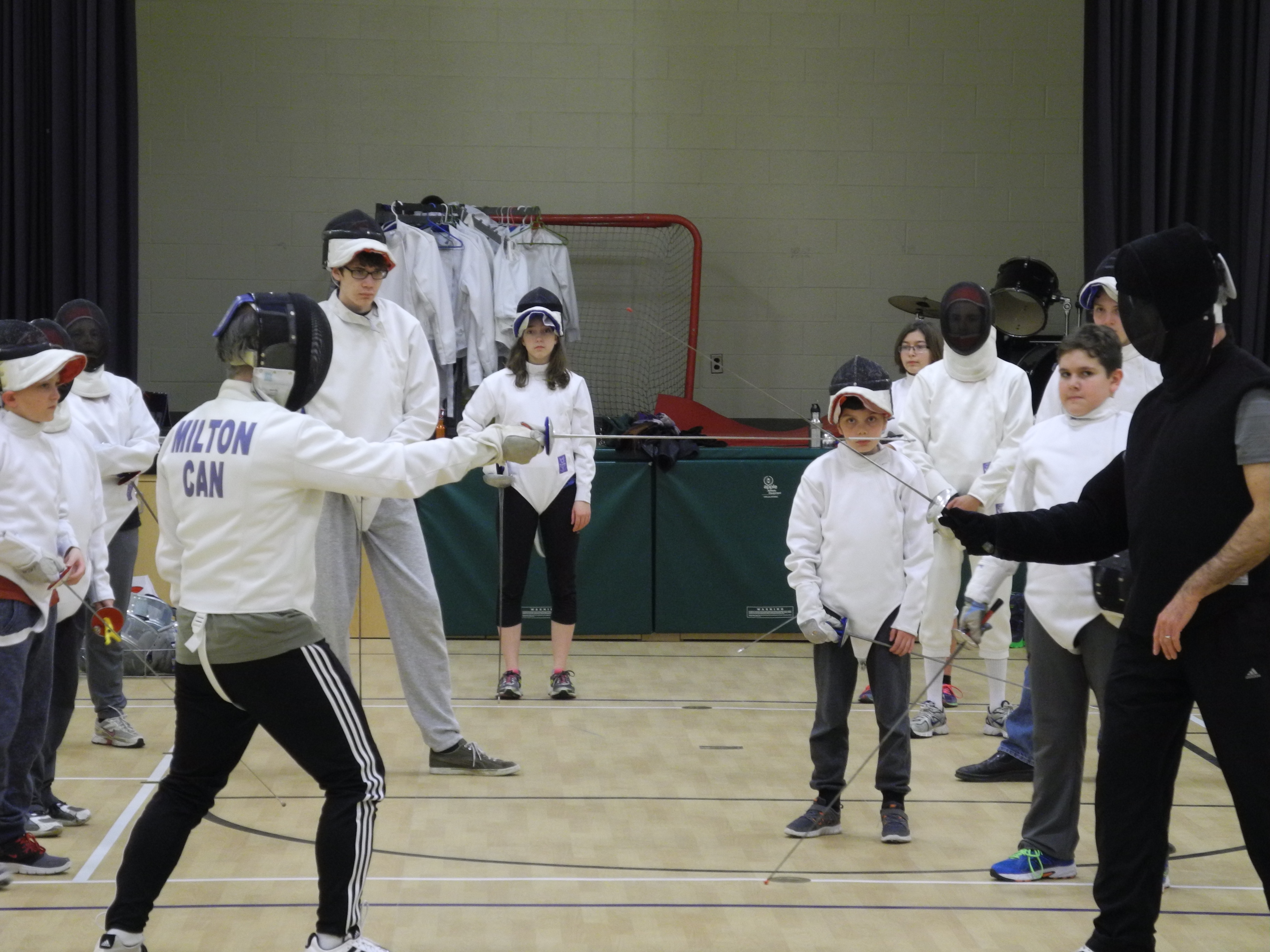 BELLEVILLE – Rob McFadden (at right, in black), demonstrates fencing skills under the watchful eyes of his students at the Loyalist Fencing Club. Photo by Buckley Smith, QNet News