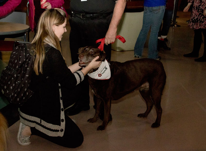 Hodgson said there is more interaction with the students because at long-term care there’s a short amount of time. “They try to get the dogs in at exam time for the relaxation and stress relief,” said Hodgson. “I think it helps the students. They seem to enjoy it and with older people it brings down their blood pressure so I think it does the same thing for students.”