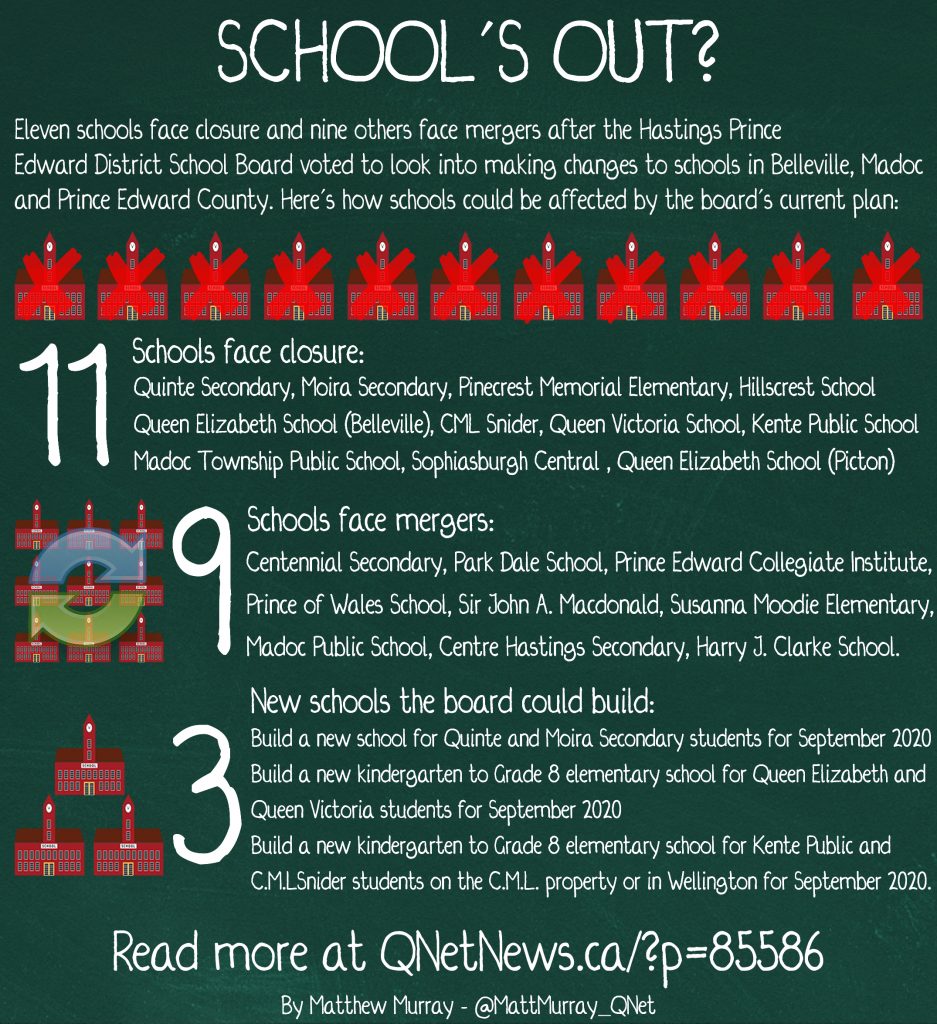 PICTON – Eleven schools face closure and nine others face consolidation after the Hastings Prince Edward District School Board voted on Monday to look into making changes to schools in Belleville and across the region.