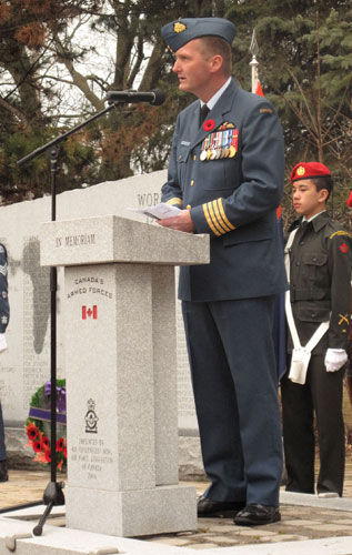Col. Dave Cochrane thanks community for commemorating the battle of Vimy Ridge at Sunday's service in Memorial Park. Photo By: Nicole Kleinsteuber