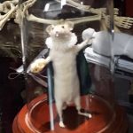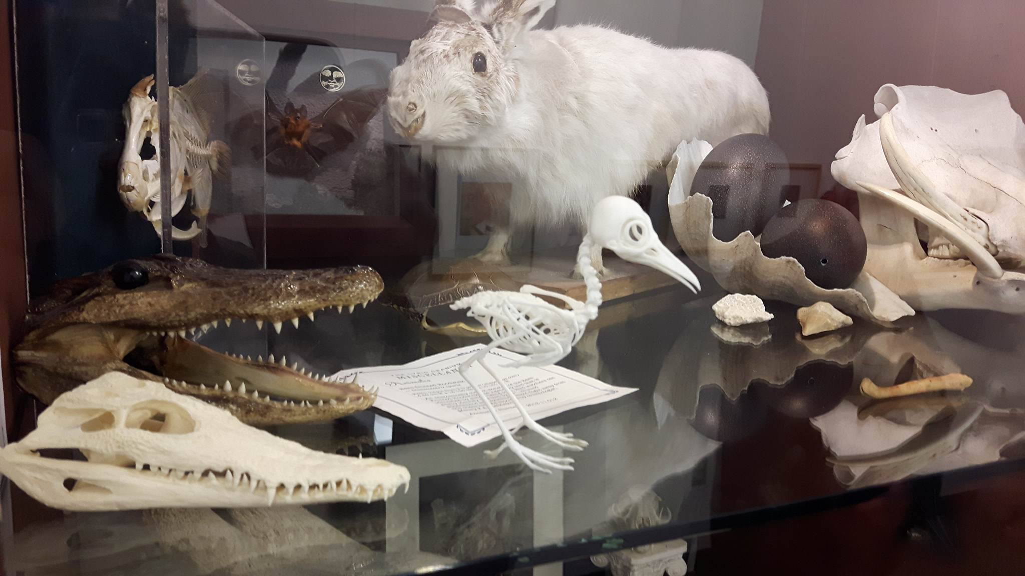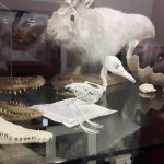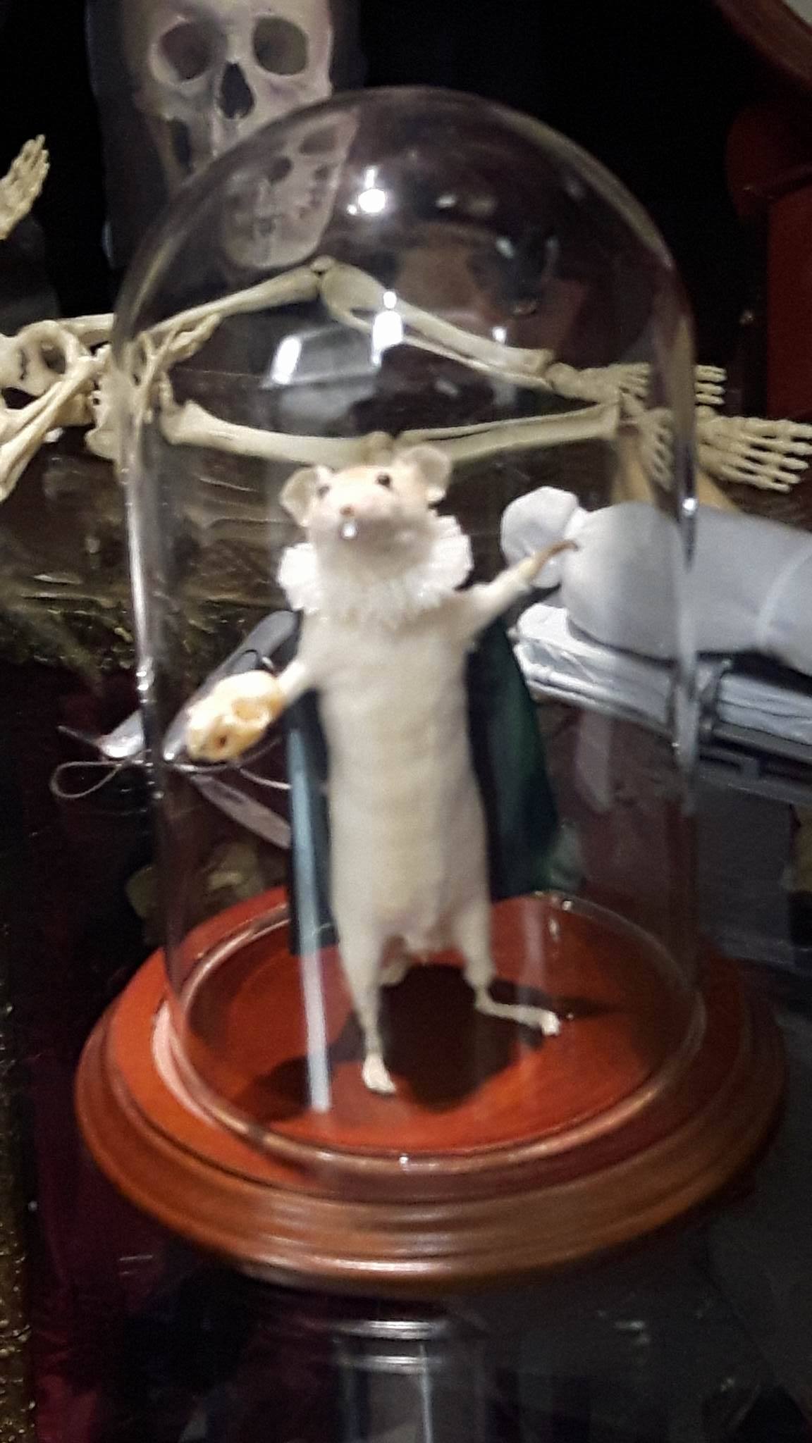 Right next to McCallum’s display is that of Morrish, her husband. Three cabinets are filled to the brim with curious objects: bottles, dolls, figurines, preserved animal heads, mice in whimsical costumes and even bones. Little skeletons and skulls fill the collection, and the large cranium of a giraffe is its centrepiece.