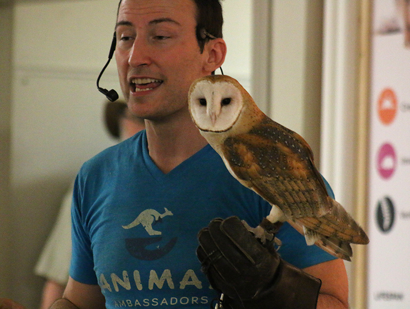 Little Ray’s Reptile Zoo’s director of outreach and education, Delivis Niedzialek, gives a presentation on responsible pet ownership with Luna the owl. Photo by Makala Chapman, QNet News