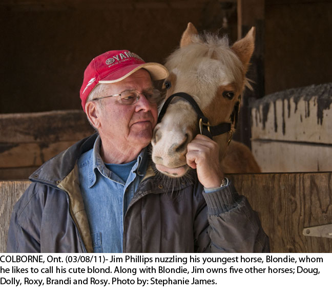 COLBORNE, Ont. (03/08/11)- Jim Phillips nuzzling his youngest horse, Blondie, whom he likes to call his cute blond. Along with Blondie, Jim owns five other horses; Doug, Dolly, Roxy, Brandi and Rosy. Photo by Stephanie James.