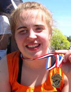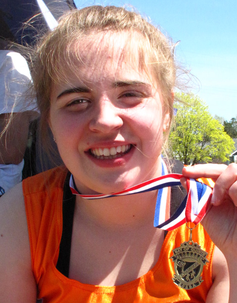 Kate Woods shows off her medal after running the ambulatory race in the Bay of Quinte track and field event on Wednesday, May 11, 2011. Kate has an acquired brain injury from a car accident, affecting the use of the right side of her body. Photo by Jennifer Bowman
