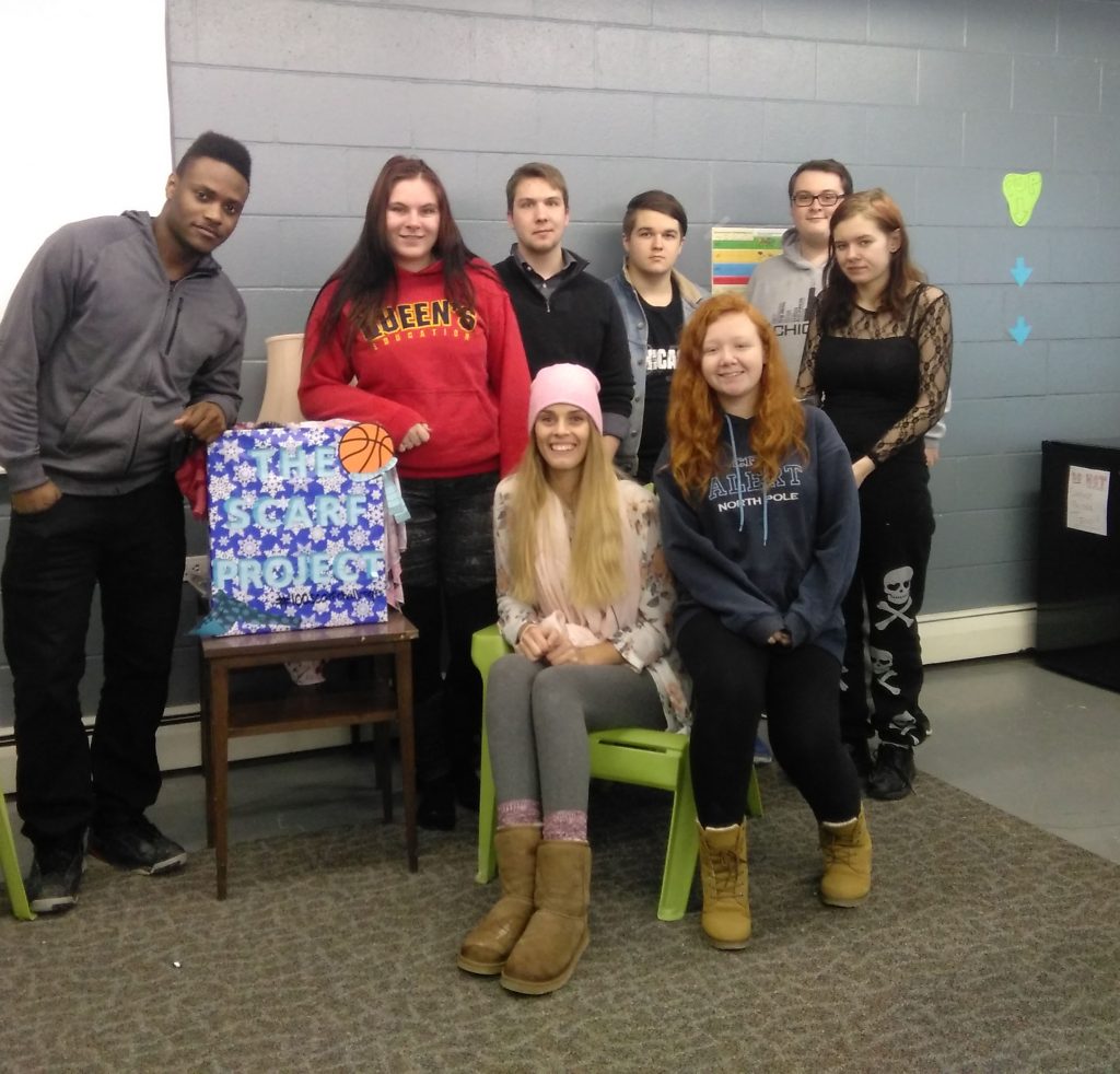 Members of the group collected scarves at the Tuesday’s game. The target of 100 was reached easily, but the exact number won’t be known until they’re counted on Friday..