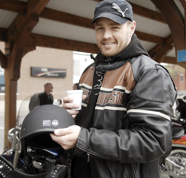 BELLEVILLE, ON (15/05/2011) Jack McLaren shows the sticker on his helmet with the word ICE during the Ride for Hunger. The ICE stickers were in honor of his mother Janice McLaren. She was a big supporter of the Ride for Hunger and rode with her son Jack in last years ride. 2011 was the 3rd annual Ride for Hunger. (Photo by Linda Horn)