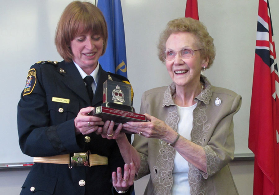 BELLEVILLE, Ont. (16/05/11) Belleville Chief of Police Cory McMullan accepts Dorothy Ellis' late husband's hat badge on behalf of the Belleville Police Service. A ceremony was held May 16 as part of Police Week to honour members of the community who are special to the Belleville Police.