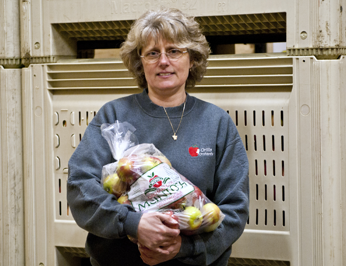 QUINTE WEST, ON. (05/26/11) Diana McPherson, owner of Grills Orchards, stands in front of bins filled with Ontario grown apples. These apples make their way to schools in the Quinte region year round. Photo by Ashliegh Gehl