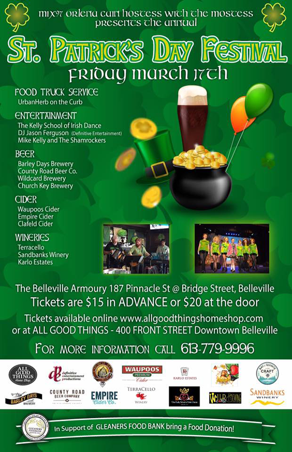 The St. Patrick’s Day Beer Cider Wine Food and Music Festival is a first-time event for Belleville. The festival at the Armoury building downtown will feature food, beer and wine vendors, including beer and cider makers belonging to the new Quinte Craft Association. There will also be a bakery and performances by a local dance school, a live band and a DJ.