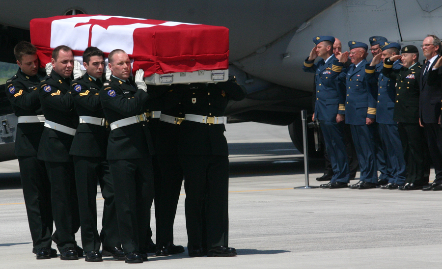 (CFB TRENTON, Trenton, May 31, 2011) Soldiers carry the body of Bombardier Karl Manning at the repatriation ceremony at CFB Trenton on Tuesday. Manning was found dead at a forward military outpost in southern Afghanistan on Friday. Photo by Jennifer Bowman