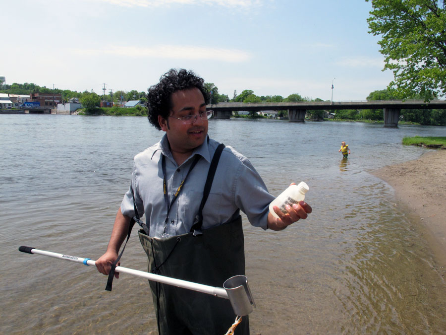 FRANKFORD, ON (30/05/2011) Nandu Latchman, student public health inspector, takes a water sample from the shores of the Trent River at Frankford Beach. The sample is put into a cooler and sent to Kingston for testing. Photo by Steph Crosier