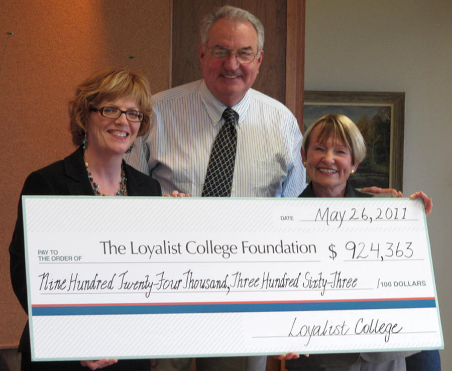 BELLEVILLE, Ont. (02/06/11) Maureen Piercy, president of Loyalist College (left), and Stuart Wright, chair of the Loyalist College Board of Governors, presented a cheque to Beverley Townsend, chair of the Loyalist College Foundation (right) on June 2. Photo by Renee Rodgers.