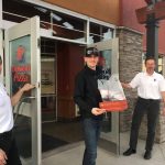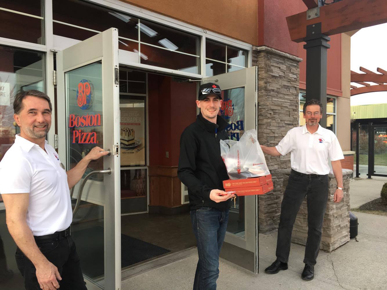 Wheelchair of Hope directors Glenn Lidstone (left) and Mike Wilcox (centre) welcome patrons alongside founder and president John Cairns at Boston Pizza Belleville’s Celebrity Server Night. Photo by Brendan Burke, QNet News