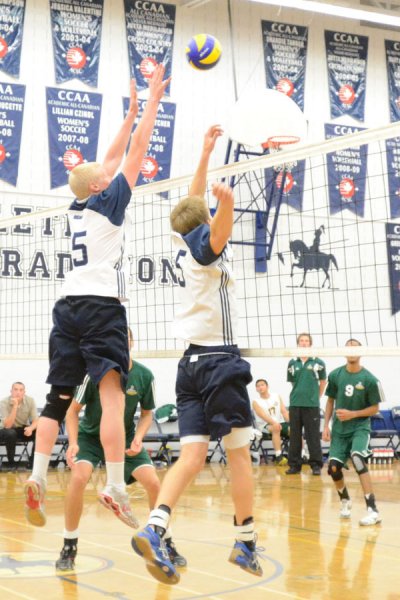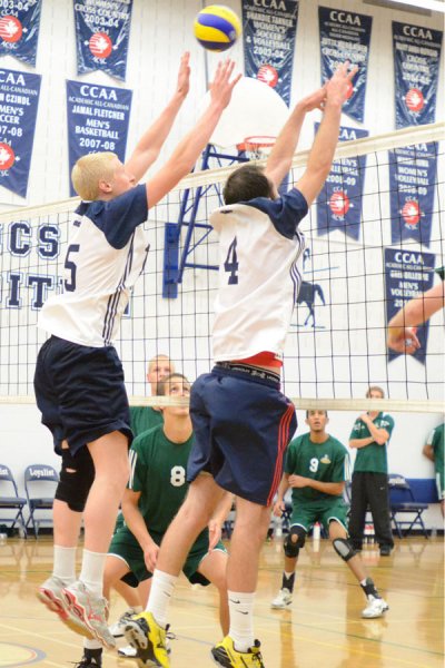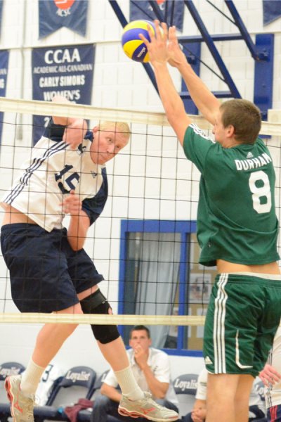 Photo by Taylor Renkema Lancers captain Matt Woods (4) and Curtis Bucking (15) block a spike from Durham