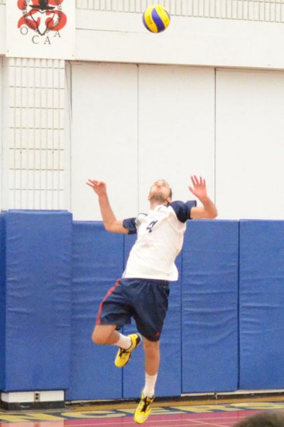 Photo by Taylor Renkema Mens volleyball captain Matt Woods launches for a serve during Wednesday night's match against Durham.
